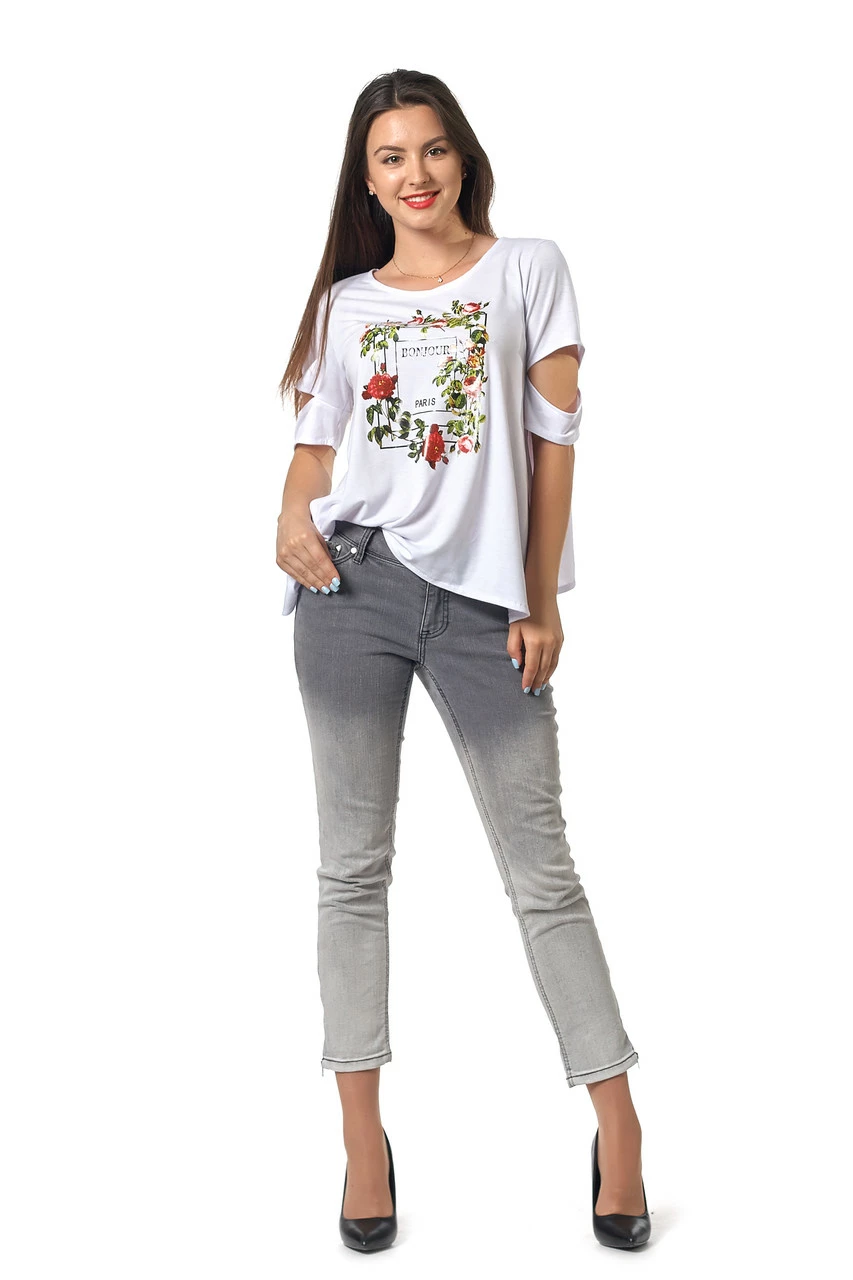 вискоза. Футболка белого цвета, с ярким цветочным принтом спереди.