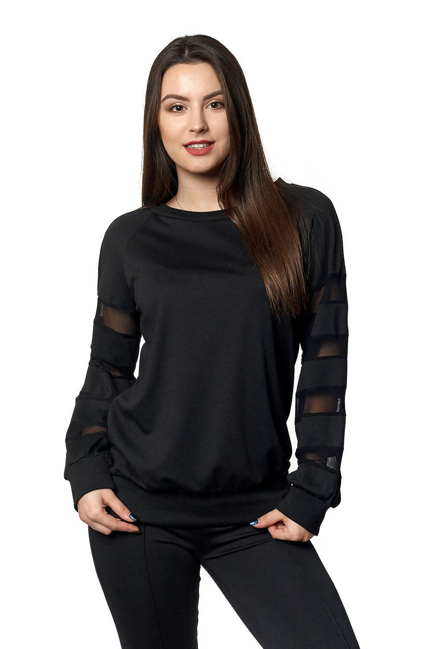 Стильная женская кофта выполнена из ткани трикотаж Lacosta  высокого качества. Кофта свободного покроя, рукава с вставками сетка, на манжетах. Кофта будет великолепно смотреться с юбками, брюками, джинсами или леггинсами. Варианты комбинаций могут быть различными.