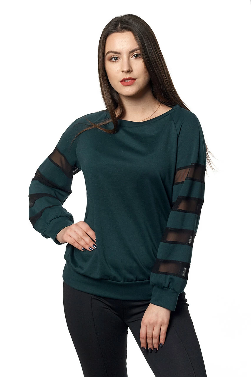Стильная женская кофта выполнена из ткани трикотаж Lacosta высокого качества. Кофта свободного покроя, рукава с вставками сетка, на манжетах. Кофта будет великолепно смотреться с юбками, брюками, джинсами или леггинсами. Варианты комбинаций могут быть различными.
