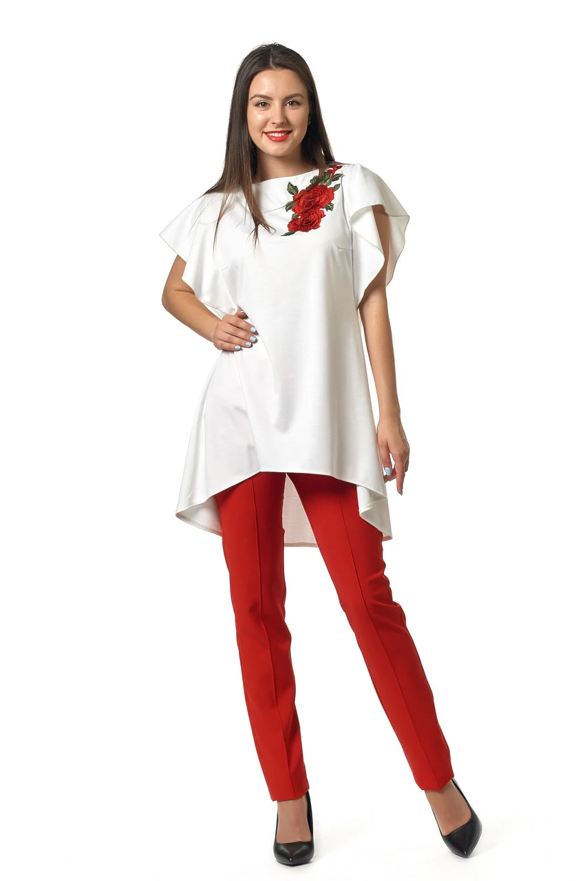 Стильный женский костюм Эльвина выполнен из высококачественного французского трикотажа. Состоит из оригинальной туники и слегка укороченных красных брюк со стрелкой. Туника контрастного цвета, с короткими рукавчиками-воланами, низ ассиметричный. Спереди туника декорирована объёмной вышитой розой, что придаёт образу модную изюминку. Этот нарядный комплект отлично подойдёт для праздников и выходов в свет.