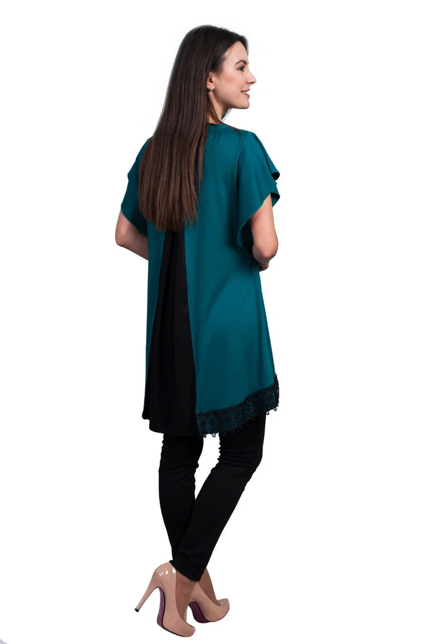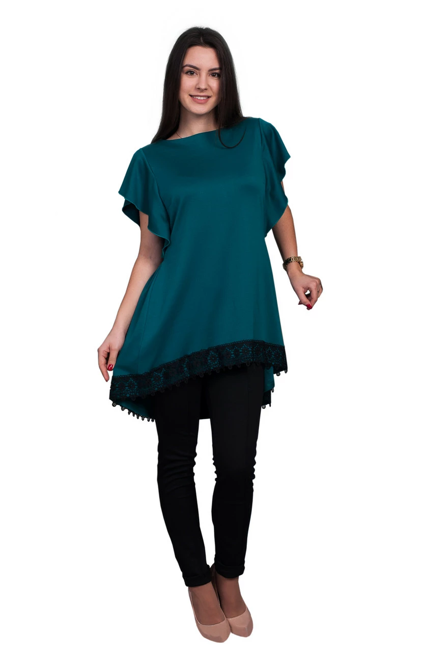 Стильный модный комплект Эльза выполнен из высококачественного французского трикотажа. Состоит из оригинальной туники и укороченных чёрных лосин со стрелками. Туника с контрастной вставкой на спинке и короткими рукавчиками-воланами, низ ассиметричный декорирован изящным кружевом. Такое дизайнерское решение отлично скроет недостатки фигуры и придаст образу модную изюминку. Этот нарядный комплект отлично подойдёт для праздников и выходов в свет.