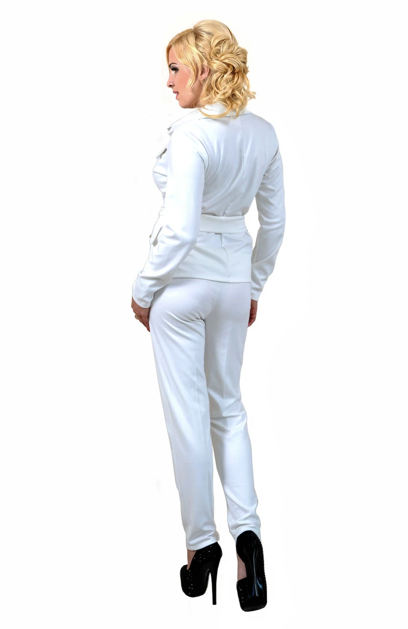 Брючный костюм Кэтрин для деловой женщины, состоящий из полу приталенного пиджака с поясом до середины бедра и зауженных, слегка укороченных брючек с идеально отутюженными стрелками, воротник, большие накладные карманы, металлические пуговицы небольших размеров. Ткань: трикотаж лакоста.