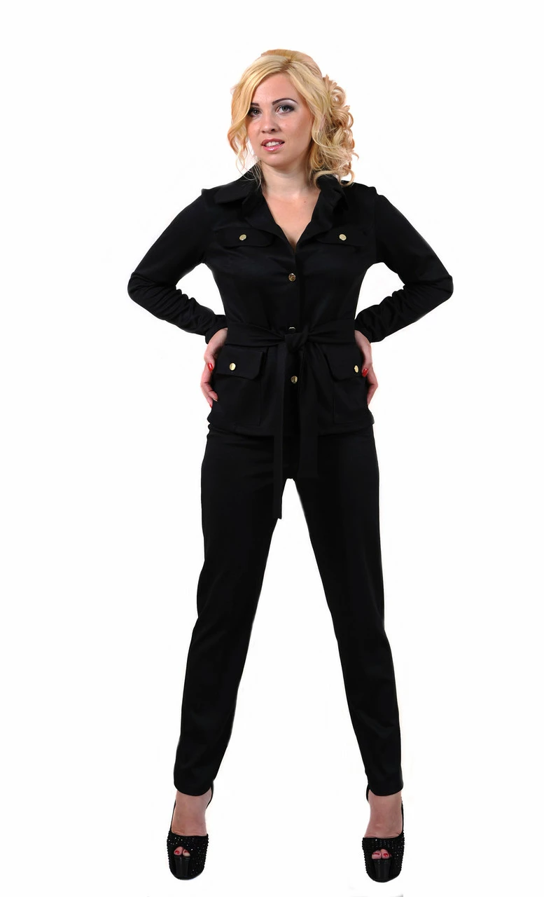 Брючный костюм Кэтрин для деловой женщины, состоящий из полу приталенного пиджака с поясом до середины бедра и зауженных, слегка укороченных брючек с идеально отутюженными стрелками, воротник, большие накладные карманы, металлические пуговицы небольших размеров. Ткань: трикотаж лакоста.