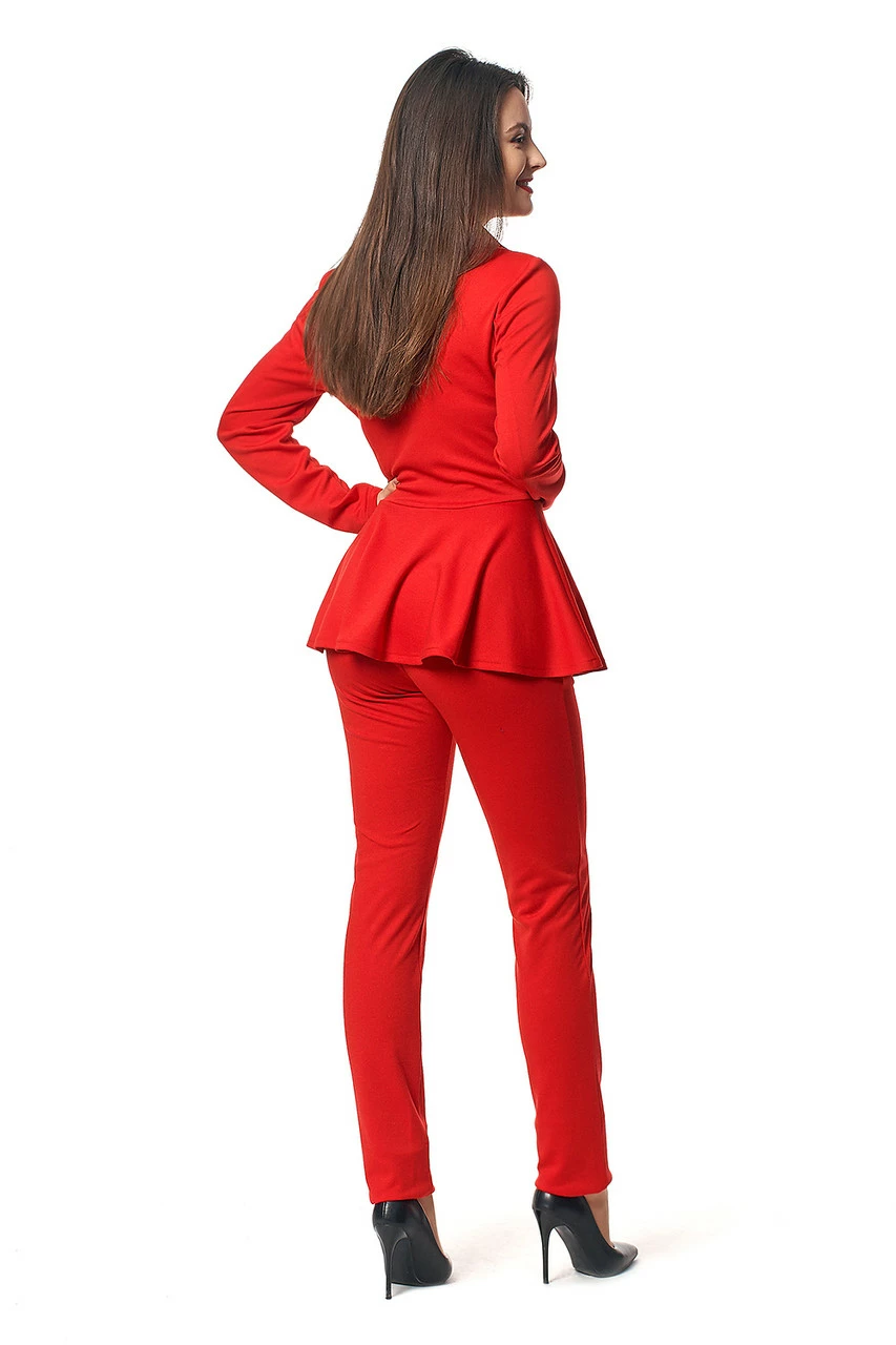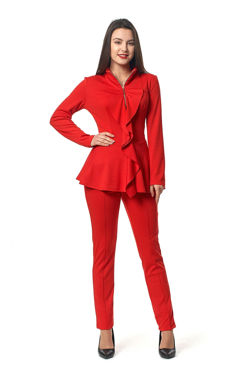 Стильный женский костюм Мейди состоит из жакета и брюк, выполнен из трикотажа Lacosta высокого качества. Пиджак слегка удлиненный с баской и длинным рукавом, застегивается на молнию. Брюки зауженные, с идеально отутюженными стрелками. Костюм отлично смотрится на любой фигуре, специальный крой скрывает недостатки и удачно подчеркивает достоинства. Такой костюм должен быть в гардеробе каждой женщины, Вы будите выглядеть очень женственно и модно. Подойдет не только на каждый день, но и для разных мероприятий.