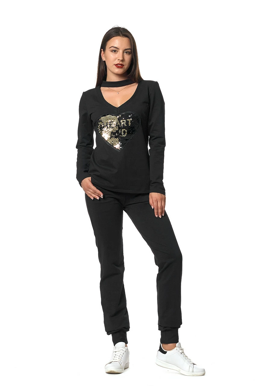 Модный женский костюм Мюнхен выполнен из натуральной трикотажной ткани – двунитка, состоит из кофты и брюк. Кофта свободного покроя, с длинным рукавом, украшена спереди принтом из пайеток в виде сердца, сзади застёгивается на золотистую молнию. Сверху к V-образному вырезу декольте пришит воротник-стойка, которая имитирует украшение на шее – чокер. Брюки в спортивном стиле, со средней посадкой, пояс на резинке, по бокам карманы, на щиколотках широкие манжеты на резинке. Такой костюм прекрасно садится по любой фигуре, не стесняет движений, и позволяет визуально скорректировать проблемные зоны. Подойдет для ежедневных прогулок и встреч с друзьями, путешествий и отдыха на природе.