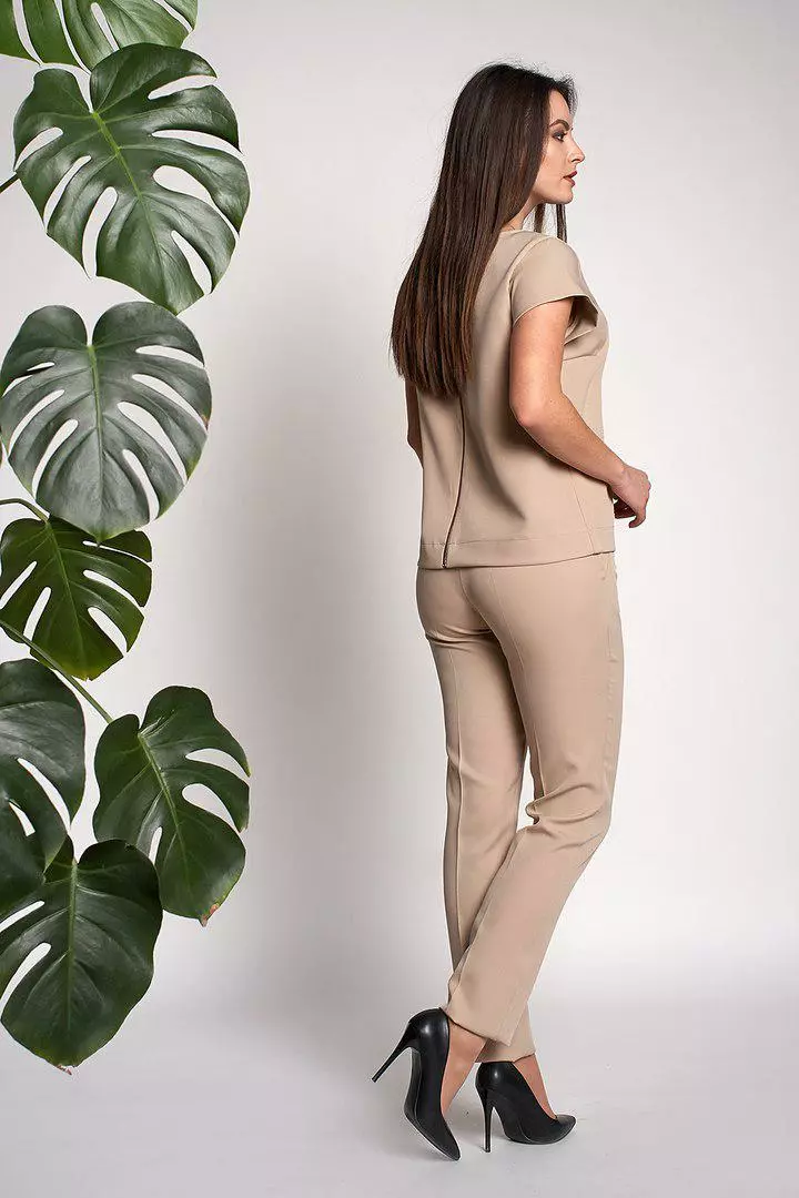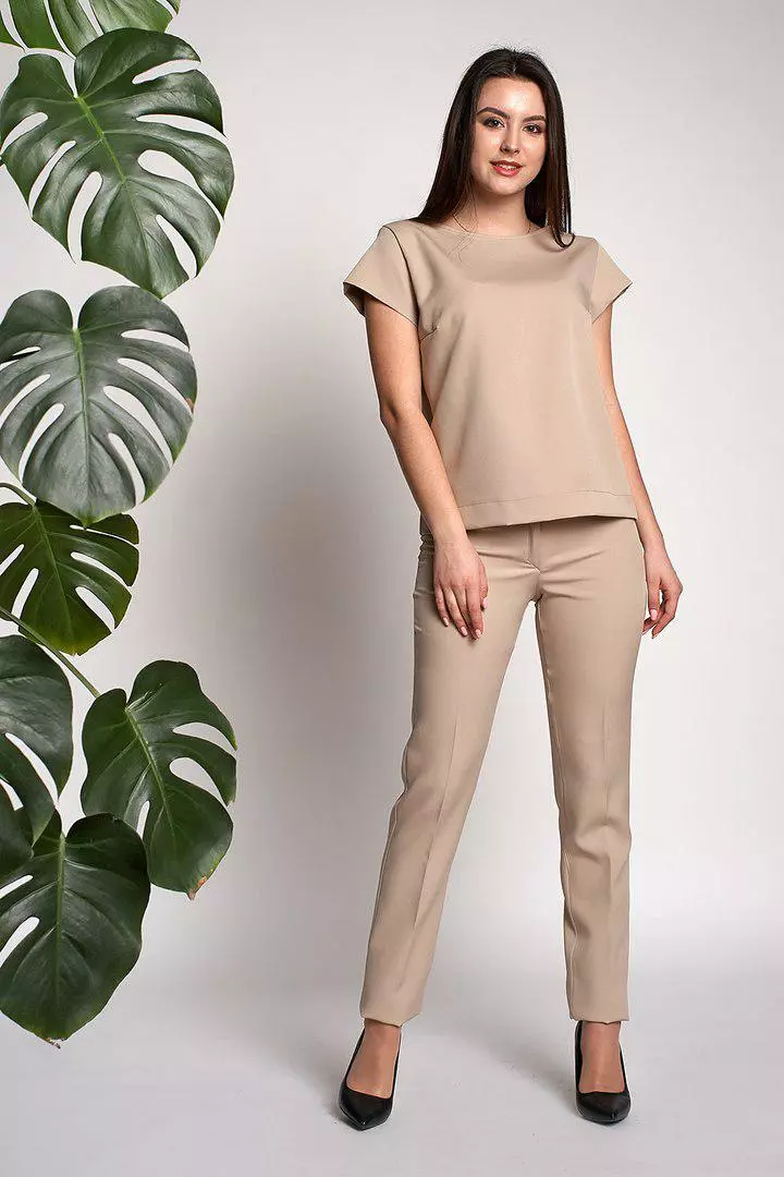 Стильный и современный костюм Нейл состоит из кофточки и брюк, выполнен из ткани креп-костюмка высокого качества. Кофточка прямого кроя с коротким рукавом, сзади по всей длине застегивается на золотистую молнию. Укороченные модные брючки со стрелкой, с высокой посадкой застегиваются на пуговицу и молнию. Такие брюки делают Вашу фигуру очень женственной, подчеркивают узкую талию и округлую линию бедер. Костюм очень модный и практичный.