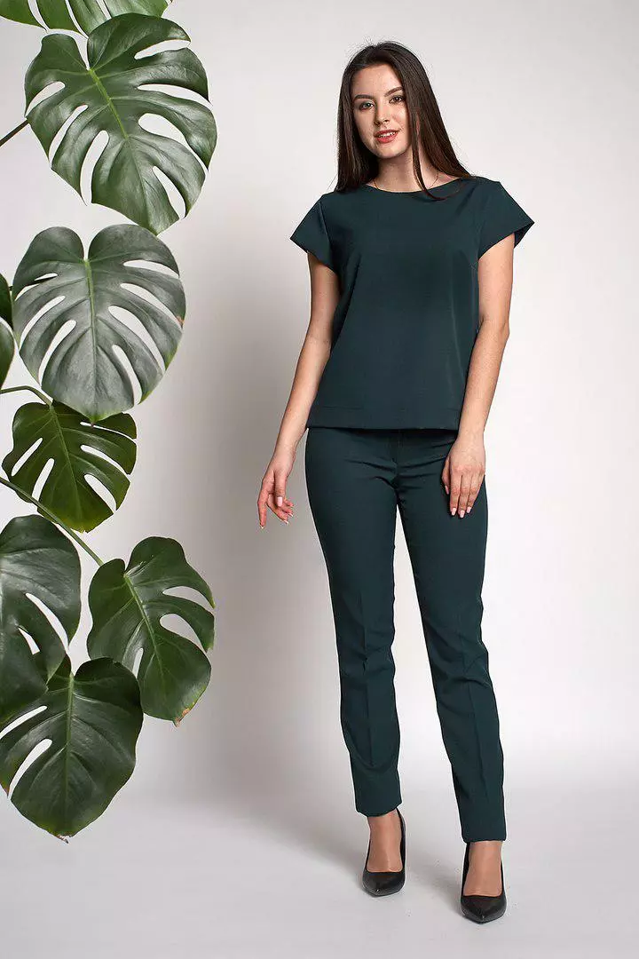 Стильный и современный костюм Нейл состоит из кофточки и брюк, выполнен из ткани креп-костюмка высокого качества. Кофточка прямого кроя с коротким рукавом, сзади по всей длине застегивается на золотистую молнию. Укороченные модные брючки со стрелкой, с высокой посадкой застегиваются на пуговицу и молнию. Такие брюки делают Вашу фигуру очень женственной, подчеркивают узкую талию и округлую линию бедер. Костюм очень модный и практичный.