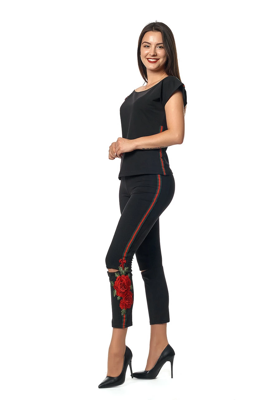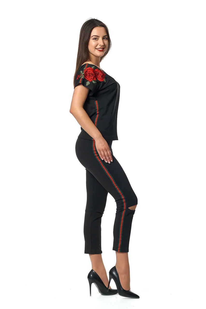 Модный женский костюм Рейчел состоит из кофты с коротким рукавом и укороченных брюк с разрезами на коленах. Выполнен из натуральной трикотажной ткани – двунитка. Оригинальности изделию придаёт контрастная полоска, пришита по бокам по всей длине, и красивая объемная вышивка, которая ассиметрично украшает рукав кофточки сверху и штанину внизу. Этот костюм эффектный и очень стильный, в нем Вы не останетесь незамеченной. Хорошо сочетается как со спортивной обувью, так и с высоким каблуком.