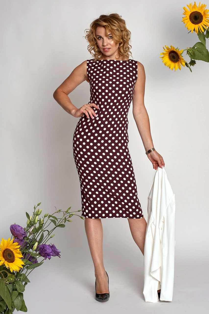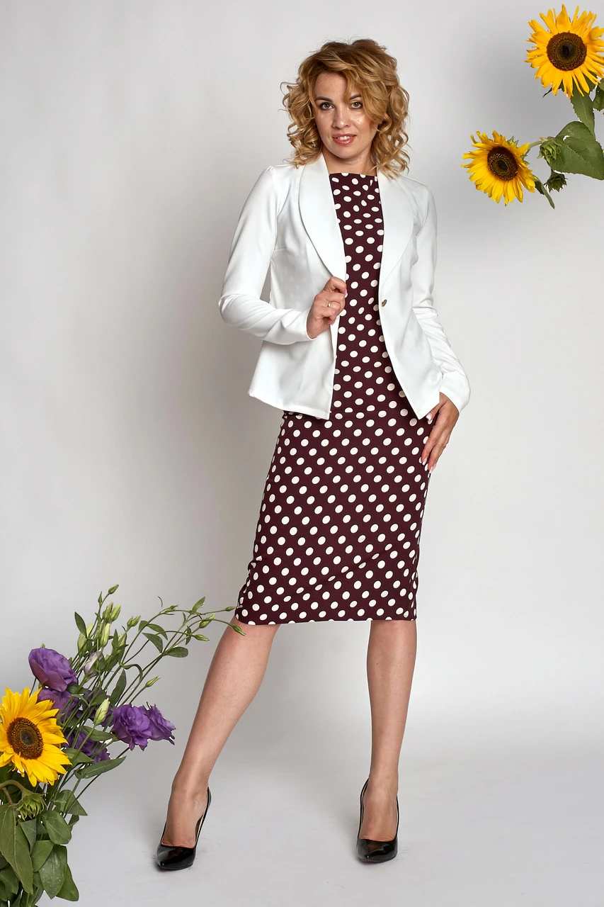 Костюм двойка (платье и пиджак) Для пошива использована ткань костюмка высокого качества. Платье в горох, который отлично корректирует пропорции фигуры и зрительно делает ее стройнее. За счет длины ниже колен платье гармонирует с традиционными лодочками, туфлями на более широком каблуке или ботильонами. Вместе с пиджаком образ выглядит более строго, но при этом стильно и нарядно.