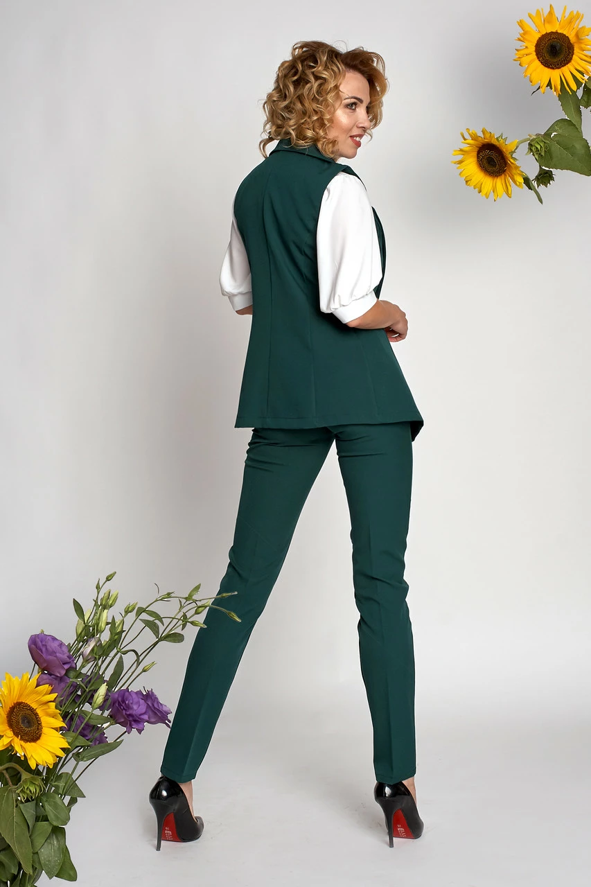 Трендовый костюм состоит из брюк и жилета. Для пошива использована ткань костюмка высокого качества. Он уместен не только в повседневных образах, в офисе, на деловой встрече, но и может служить в качестве вечернего наряда.