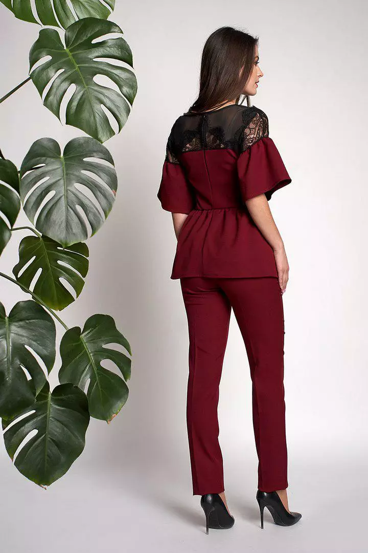Ультрамодный женский костюм Вилоу выполнен из ткани креп-костюмка высокого качества. Блуза свободного покроя с баской, рукава красивые воланы расклешонной  формы, гипюровая вставка украшает зону декольте. Брюки на высокой посадке, зауженные, с идеально отутюженными стрелками.  Костюм красиво ложится по фигуре, скрывает не достатки или подчеркивает достоинства, Вы будите себя чувствовать уютно и красиво. Такой костюм можно одеть на любое торжество, идеально смотрится с туфлями-лодочками.