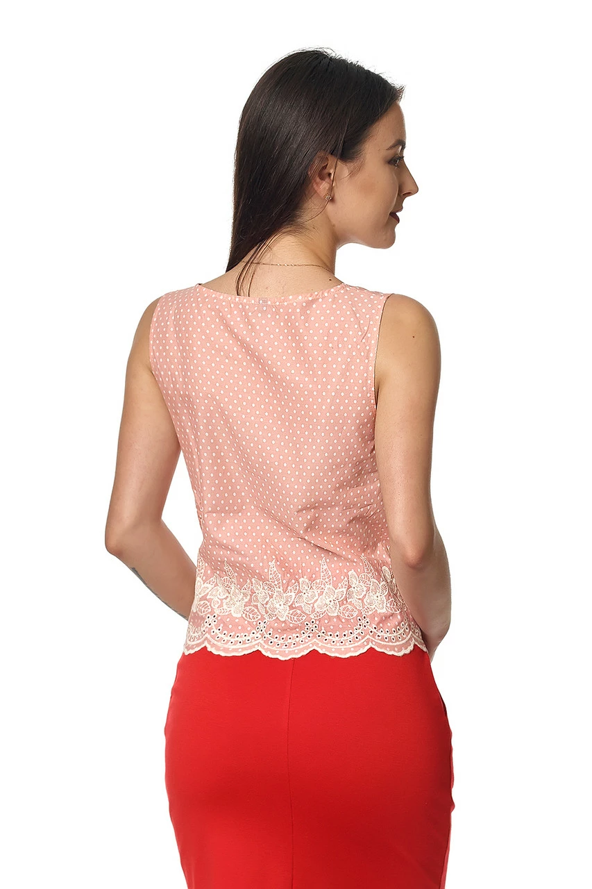 Нежная майка Милла из натурального тонкого коттона в горошек, с глубоким круглым вырезом, без рукавов. Подол украшает изящная вышивка с перфорацией. Такая маечка подойдет как на работу к деловому костюму или любимой-юбке-карандаш, так и к любимым джинсам или шортам на каждый день.