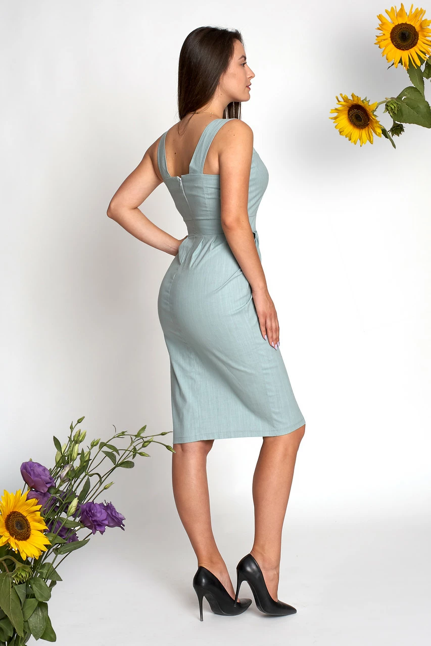 Платье Аида выполнено из ткани лен высокого качества. Стильное платье-футляр длинной чуть ниже колена, на широких бретельках, с открытым декольте, по бакам карманы. Платье очень женственное, хорошо садится по фигуре. Платье-футляр можно одевать на выходы, но его также можно надевать на деловые встречи. В нем Вы будите выглядеть стильно и модно.