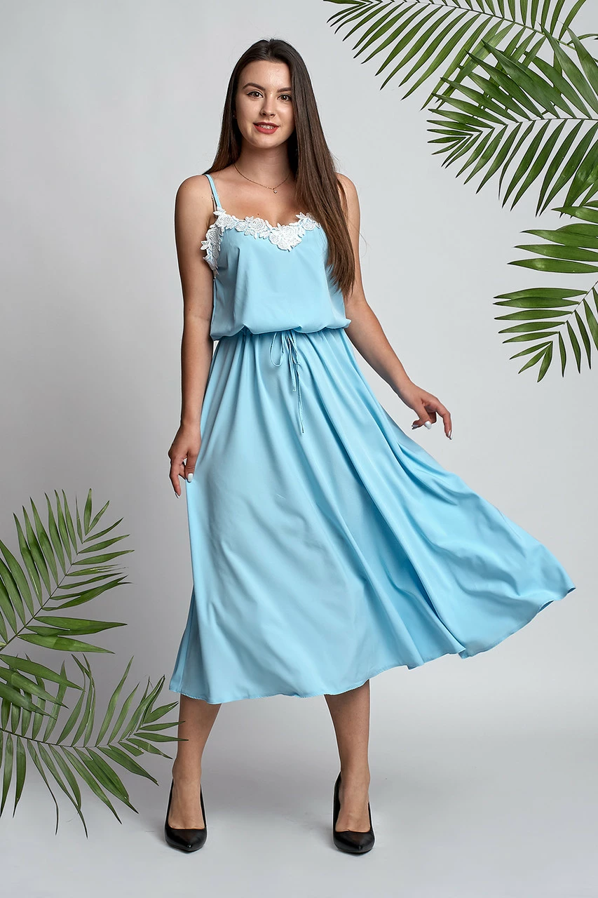 Женское платье Алана выполнено из ткани софт высокого качества. Платье длиной до середины икры, на тонких бретелях украшено красивым кружевом. Такая моделька хорошо скрывает недостатки фигуры или наоборот подчеркивает достоинства. Платье можно сочетать с разной обувью, красиво смотрится с туфлями лодочками или балетками.