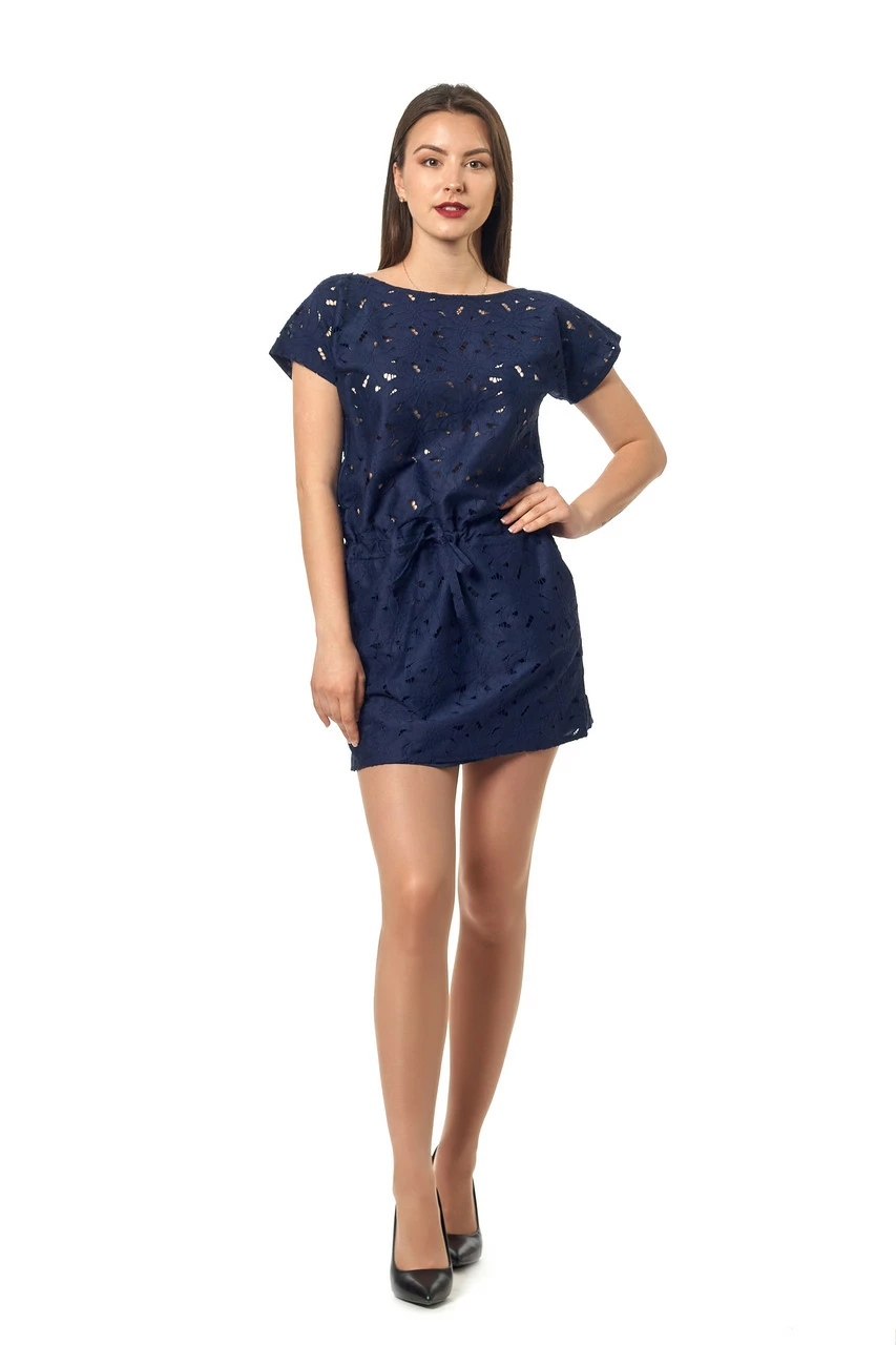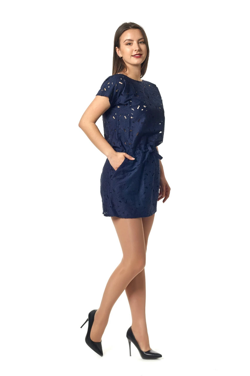 Стильное женское платье, выполнено в свободном стиле. Ткань – гипюр, подкладка внизу – интерлок. Короткое платье с вырезом – лодочка, цельнокроенными рукавчиками, и шнурком в тон на поясе, по бокам карманы. Такое платье в дополнении с босоножками на каблуке и ярками аксессуарами создаст изысканный образ для вечернего выхода в свет. Днем его можно смело одевать для прогулок и встреч с друзьями, легкая ткань будет делать комфортной жаркую летнюю погоду. Свободный крой отлично скроет недостатки фигуры, а длина-мини подчеркнёт красоту женских ног.