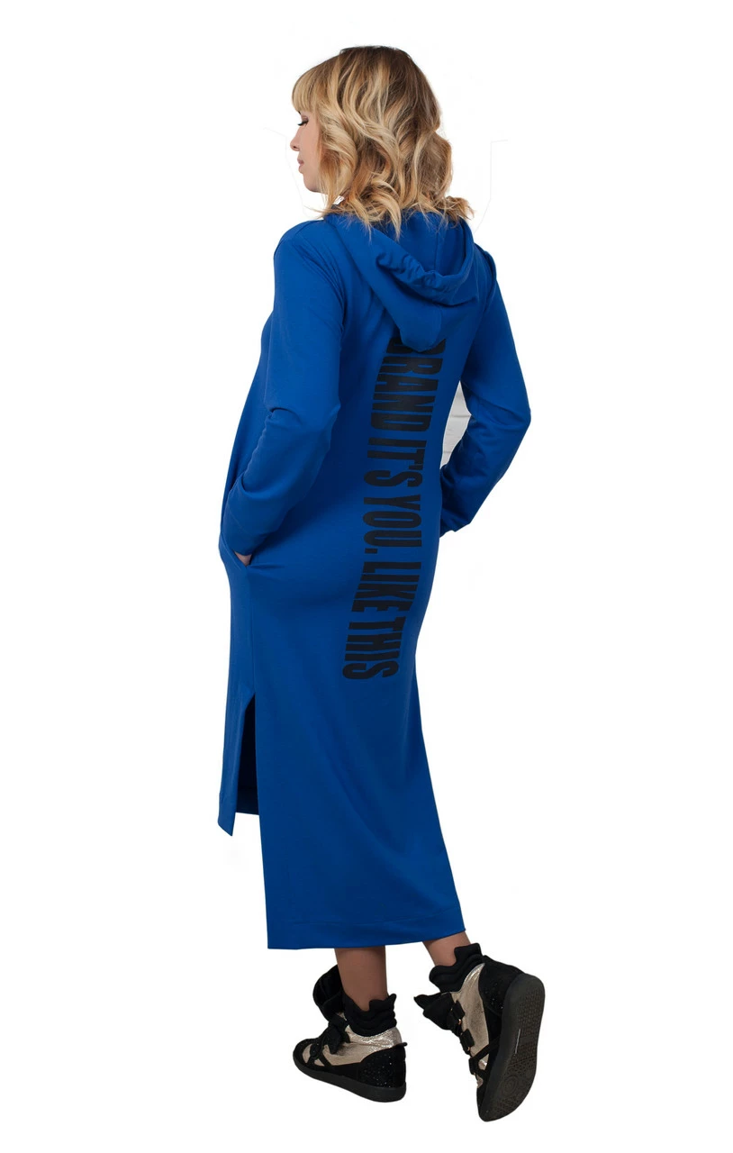 Спортивное стильное платье Brend в casual-стиле, выполнено из приятного и теплого трикотажа двунитка. Платье с капюшоном и карманами, низ ассиметричный с разрезами по боках. Изюминкой платья является вертикальная надпись на спине. В этом платье вы почувтвуете себя комфортно и удобно, стильно и демократично.