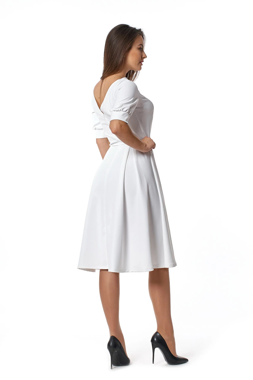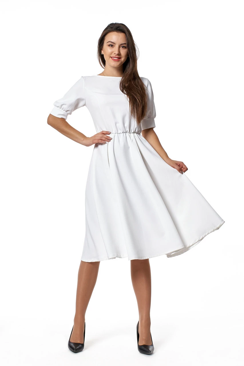 Красивое женское платье Дарина выполнено из высококачественной костюмной ткани. Платье средней длины, с вырезом-лодочка, сзади треугольный вырез, застёгивается на потайную молнию. Рукавы-фонарики с манжетом, талия на резинке, юбка расклешенная. Такое платья легкое и женственное, Вы будете выглядеть в нем нарядно и нежно.