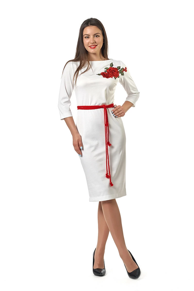 Женское платье Эмилия выполнено из высококачественного французского трикотажа. Классическое платье модной длины-миди, с рукавом ¾ и вырезом-лодочка. Спереди украшено объёмной вышитой розой, переходящей на рукав. Линию талии подчёркивает пояс красного цвета. Такое платье должно быть в гардеробе каждой женщины, его можно смело одеть как на работу, так и на праздник.