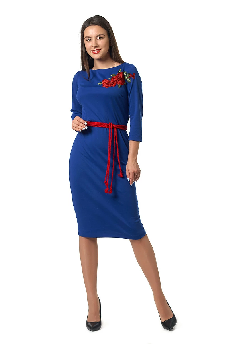 Женское платье Эмилия выполнено из высококачественного французского трикотажа. Классическое платье модной длины-миди, с рукавом ¾ и вырезом-лодочка. Спереди украшено объёмной вышитой розой, переходящей на рукав. Линию талии подчёркивает пояс красного цвета. Такое платье должно быть в гардеробе каждой женщины, его можно смело одеть как на работу, так и на праздник.