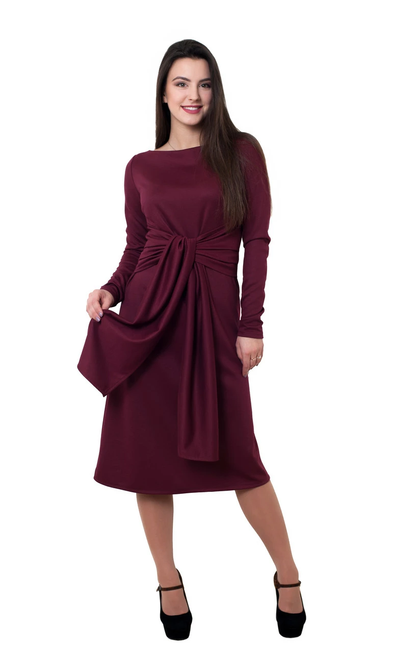Красивое платье Франческа выполнено из однотонного французского трикотажа высокого качества. Платье длины миди, трапециевидного покроя, с длинным рукавом. Слегка расклешенная книзу юбка создает женственный романтический образ, а модной изюминкой служит декоративный пояс из ткани в тон платью, который можно завязывать спереди и назад. Мы советуем завязывать пояс спереди, ведь это моделирует фигуру и создает Х-образный силуэт, визуально подчёркивая грудь и сужая талию. Платье отлично подойдет как для работы, так и для вечернего выхода в свет.