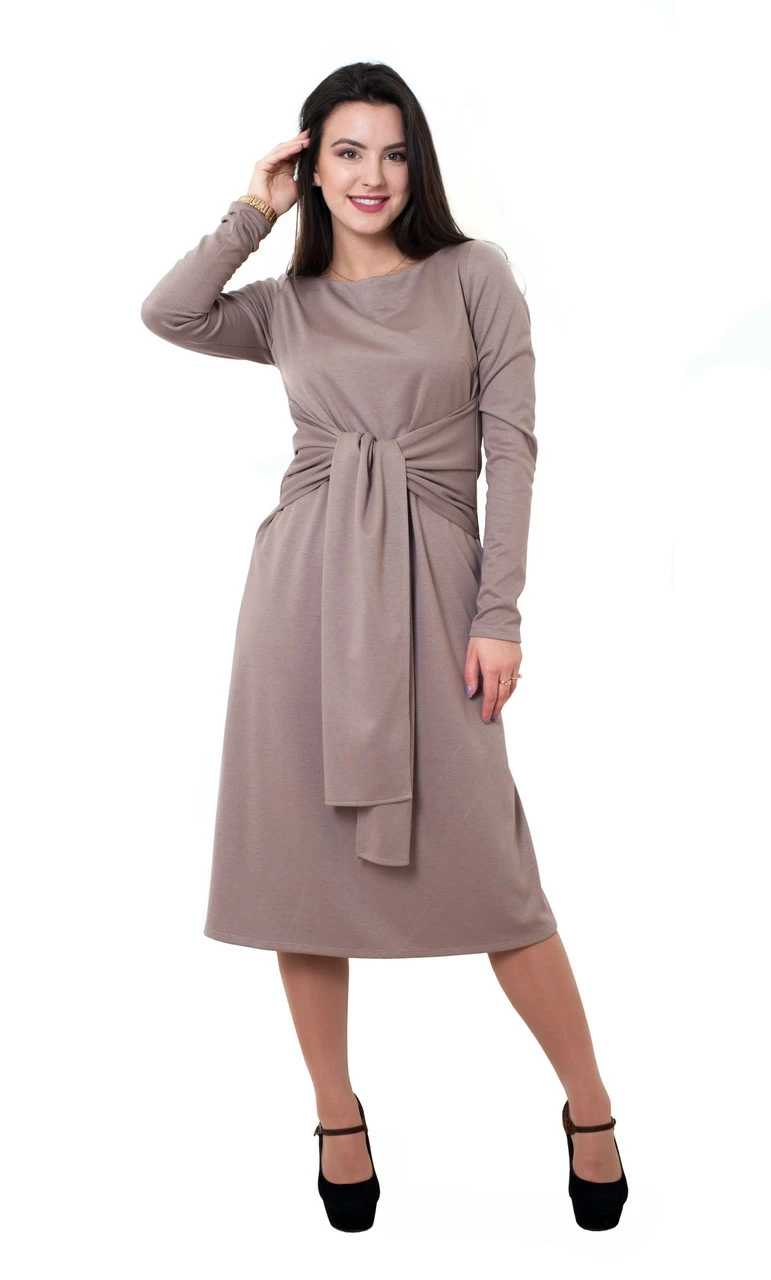 Красивое платье Франческа выполнено из однотонного французского трикотажа высокого качества. Платье длины миди, трапециевидного покроя, с длинным рукавом. Слегка расклешенная книзу юбка создает женственный романтический образ, а модной изюминкой служит декоративный пояс из ткани в тон платью, который можно завязывать спереди и назад. Мы советуем завязывать пояс спереди, ведь это моделирует фигуру и создает Х-образный силуэт, визуально подчёркивая грудь и сужая талию. Платье отлично подойдет как для работы, так и для вечернего выхода в свет.