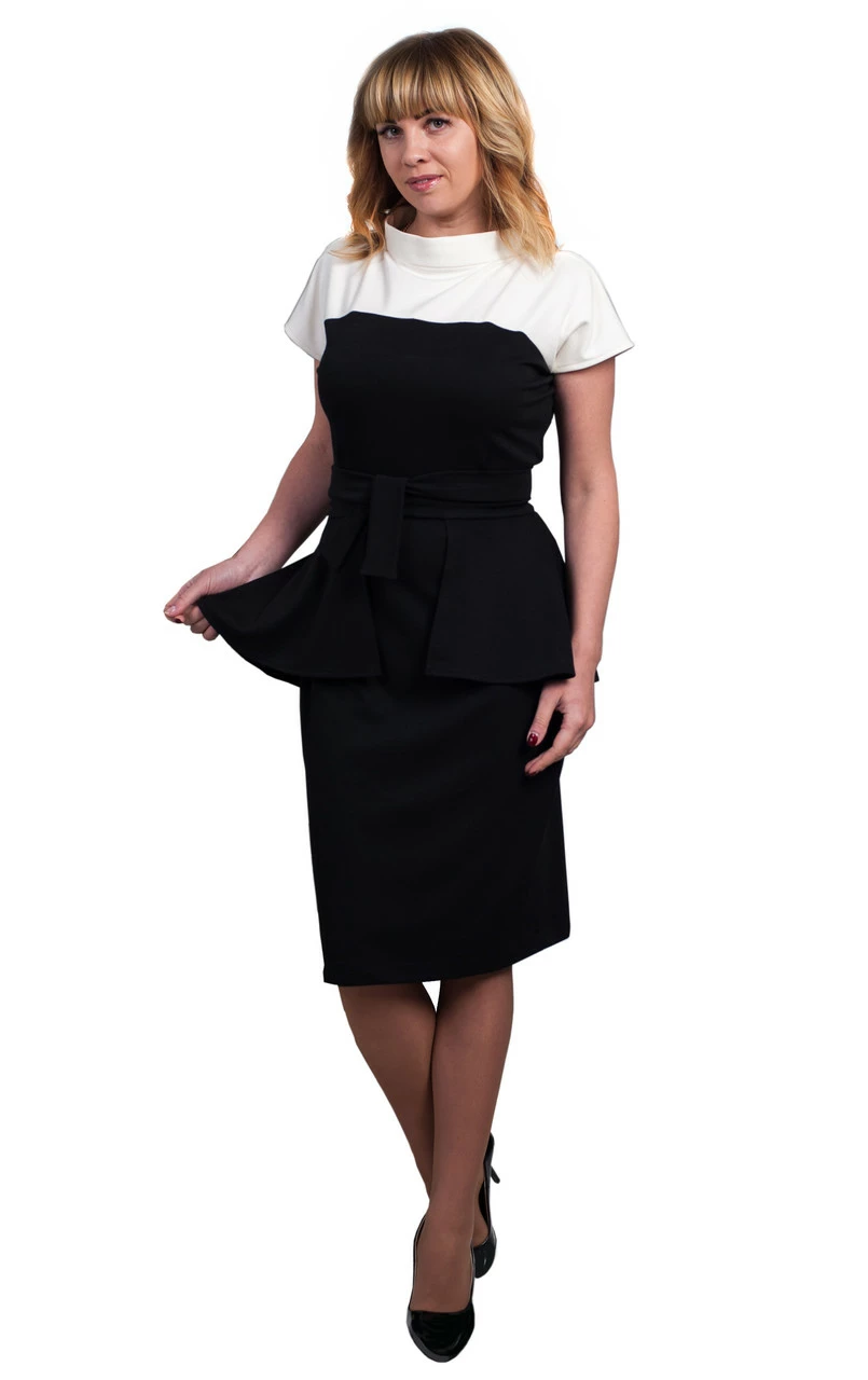 Оригинальное женское платье Ирена выполнено из высококачественного французского трикотажа. Платье прямого покроя, приталенного силуэта, с коротким рукавом. Верх изделия контрастного цвета, воротник — широкая стойка. В комплект входит съёмная баска, что позволяет создавать два неповторимых образа.  Кроме этого, она отлично скроет мелкие недостатки фигуры. В таком наряде Вы будете выглядеть красиво, стильно и современно.