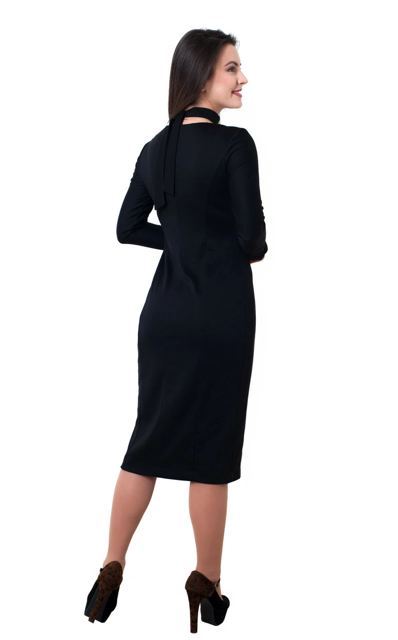 Красивое вечернее платье Кларисса выполнено из французского трикотажа высшего качества. Изделие длины миди, прямого покроя, приталенного силуэта, с длинным рукавом. Украшением служит вырез декольте, декорированный завязкой на шею в стиле choker и золотистыми цепочками. Такое платье украсит Ваш образ на светском выходе или романтическом свидании.