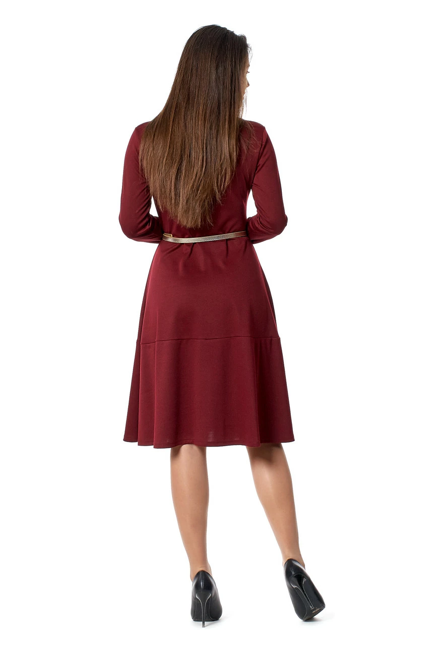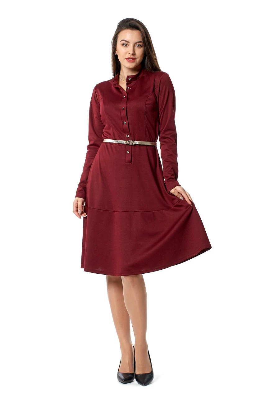 Красивое женское платье Мальва выполнено из трикотажа лакоста высокого качества. Сверху рубашечного кроя, воротник-стойка, с длинными рукавами, застёгивается на золотистые пуговицы. Юбка слегка расклешённая, красиво спадает книзу легкими складочками. Такое платье обязательно понравится всем представительницам прекрасного пола, оно удачно подчёркивает достоинства фигуры и скрывает недостатки. Хорошо подойдет как для повседневной носки на работу, так и для выхода в свет в комбинации с туфлями на каблуке и яркими аксессуарами.