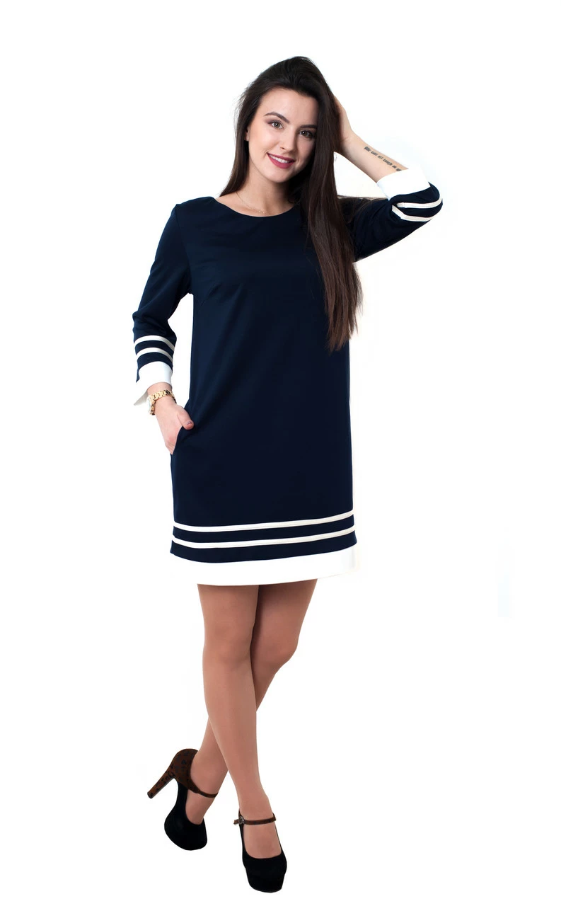 Красивое платье Марта выполнено из французского трикотажа высокого качества. Изделие трапециевидного покроя, свободного силуэта, рукав ¾, с круглым вырезом, без застёжки, по бокам карманы. Изюминкой платья выступают контрастные горизонтальные полоски разной ширины на подоле и манжетах, что придаёт Вашему образу оригинальности. Длина платья выше колена удачно подчеркнёт красоту женских ножек, а свободный фасон отлично скроет все недостатки фигуры. Такой наряд практичный и универсальный, подойдёт на все случаи жизни и несомненно станет любимым предметом Вашего гардероба.
