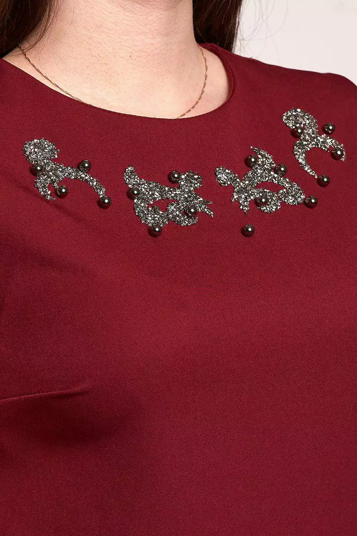 Женственное платье Мирела выполнено из ткани креп-костюмка высокого качества. Платье прямого покроя, длинной миди, с коротким рукавом. Украшением платью служат черные камни с жемчугом. Такое платье смело можно одеть на работу и на мероприятие, в нем Вы будите выглядеть женственно, стильно и красиво.