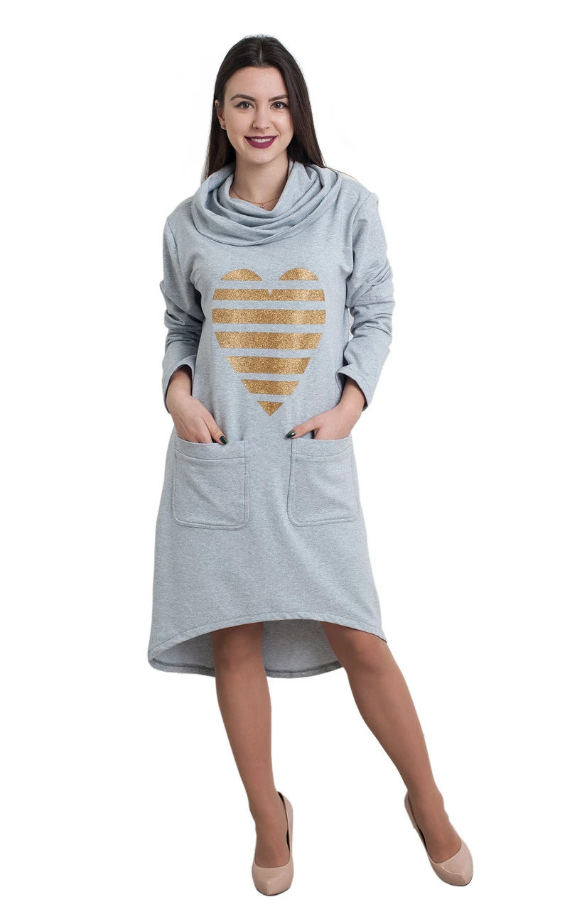 Спортивное стильное платье Сердце в casual-стиле, выполнено из приятного и теплого трикотажа двунитка. Платье со стильным воротником и двумя накладными карманами, низ ассиметричный. В этом платье вы почувтвуете себя комфортно и удобно, стильно и демократично. Стильно смотрится как под любую спортивную обувь так и под каблук.