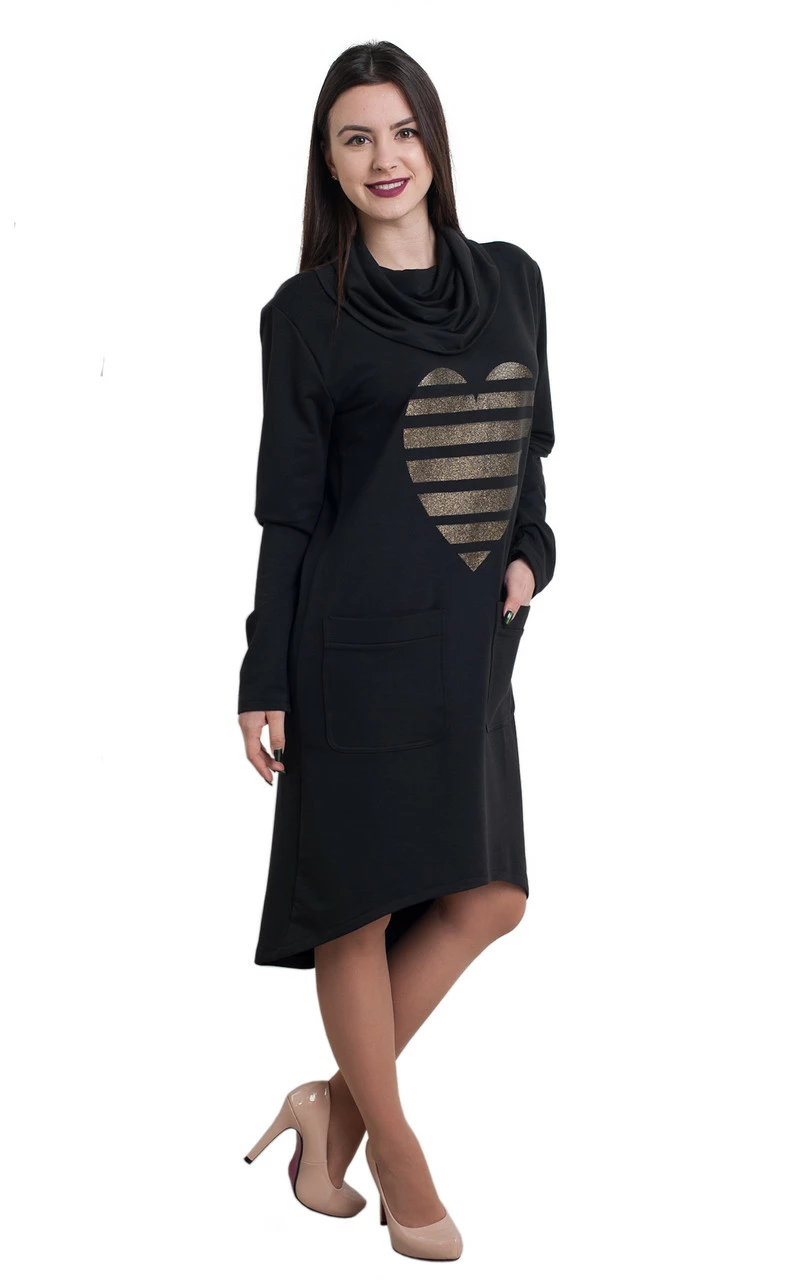 Спортивное стильное платье Сердце в casual-стиле, выполнено из приятного и теплого трикотажа двунитка. Платье со стильным воротником и двумя накладными карманами, низ ассиметричный. В этом платье вы почувтвуете себя комфортно и удобно, стильно и демократично. Стильно смотрится как под любую спортивную обувь так и под каблук.