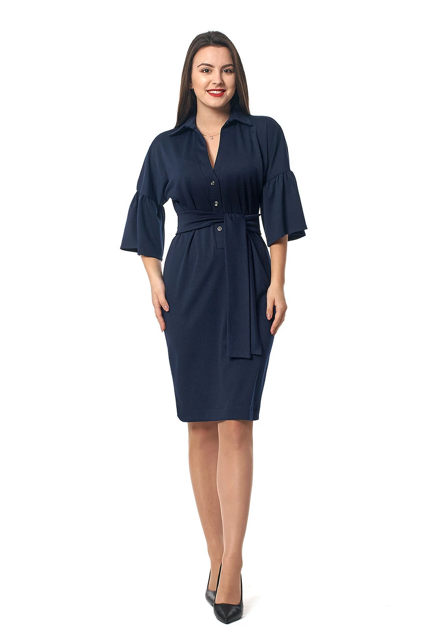 Женственное платье Теона выполнено из трикотажа Lacosta высокого качества. Платье длинной до колен, рукава расклешенной формы красивыми воланами, на пуговичках. Линию талии подчеркивает пояс, который входит в комплект.