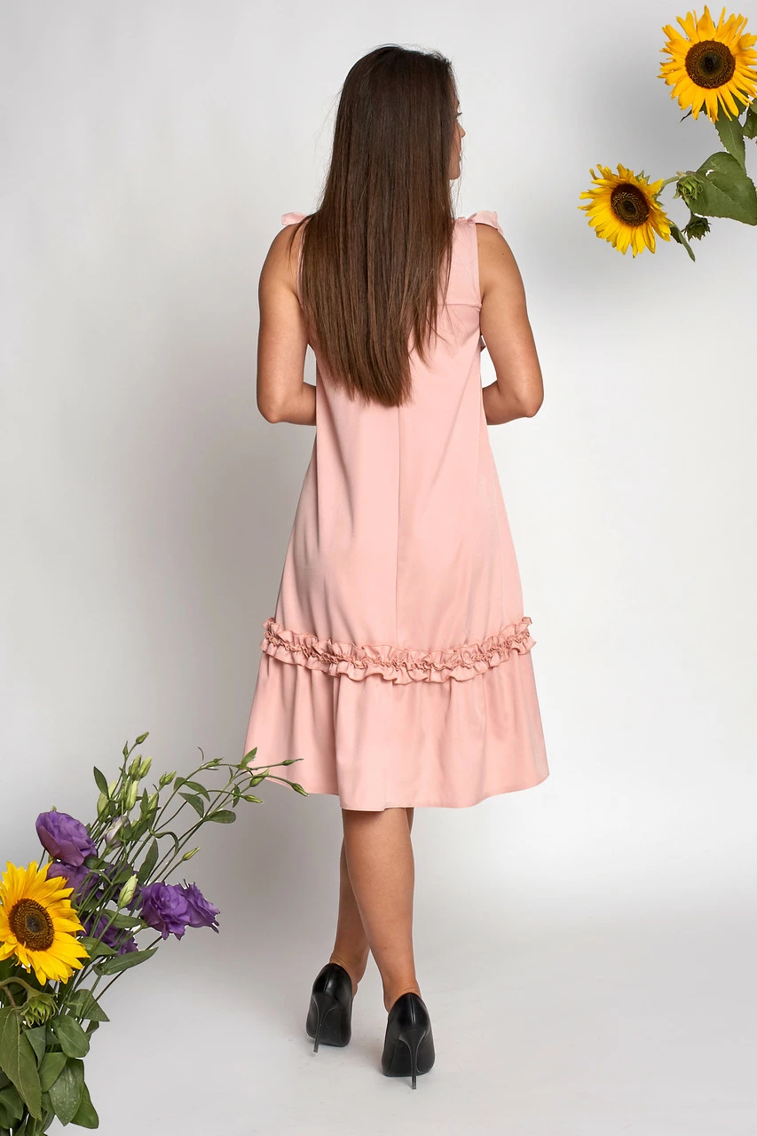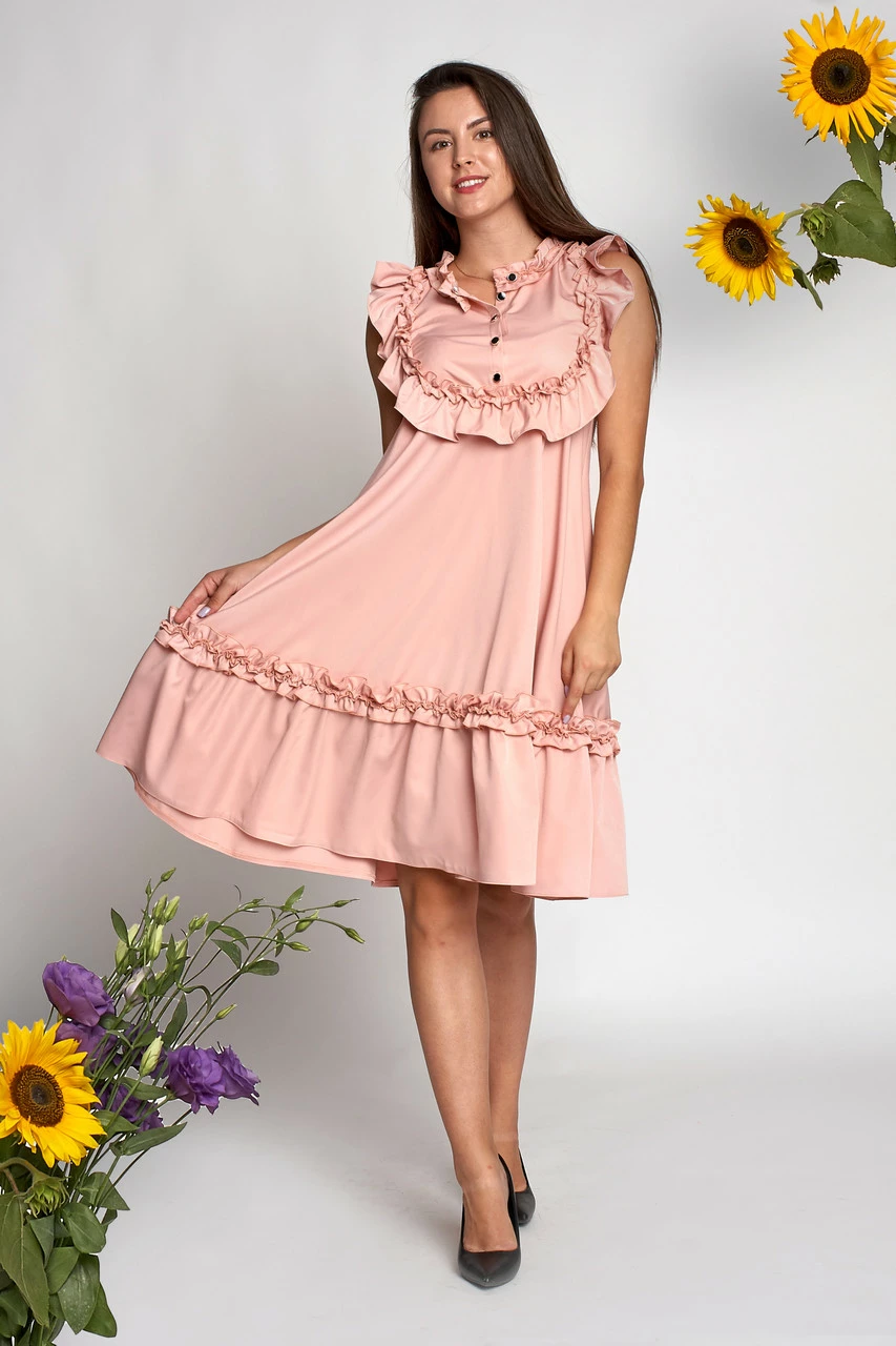 Платье Влада пошито из ткани костюмка высокого качества. Платье длиной миди, свободного покроя, украшением служат красивые рюши и пуговички на груди. Платье Влада идет в комплекте с черным пояском с золотистой пряжкой. Такое платье отлично подойдет для любого типа фигуры, в нем Вы будете выглядеть потрясающе. Красиво смотрится с туфлями – лодочками.