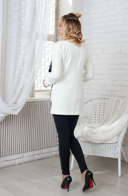 Низ ассиметричный, застегивается на одну пуговицу. Особого стиля изделию придают накладные карманы и оригинальный воротник, выполнены из эко-кожи. Такой кардиган очень современный и модный, отлично подойдет к любому базовому наряду.
