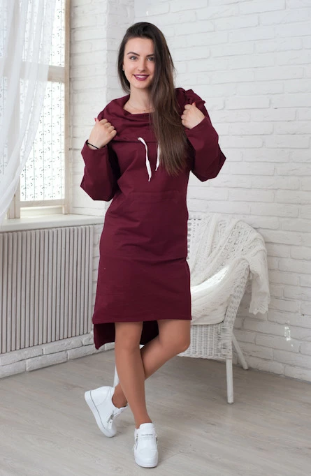 Модное платье Селин в casual-стиле, выполнено из высококачественного трикотажа двунитка. Изделие полуприталенное, низ асимметричного покроя, с длинным рукавом. Есть капюшон, который собирается складками, с контрастным шнурком. Спереди платье украшено накладным карманом. Изделие очень стильное и красивое, оно подчеркнет Ваши стройные ножки и прекрасно скроет недостатки фигуры.