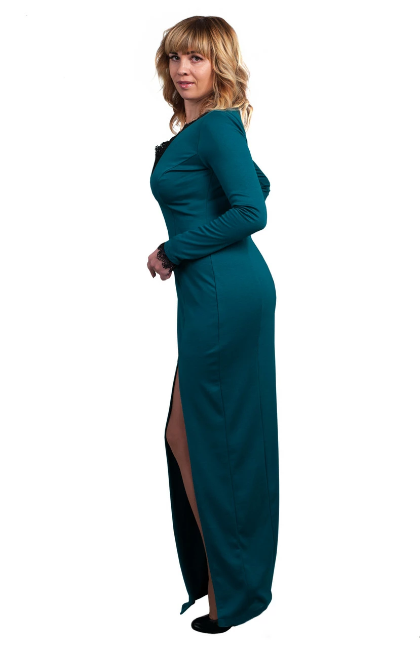 Красивое женское платье в пол Патриция выполнено из высококачественного трикотажа — лакоста, декольте и манжеты рукавов украшены кружевом. Платье прямого покроя, приталённого силуэта, с длинным рукавом и V-образным вырезом. Изюминкой платья есть разрез в рельефном шве. Такой наряд выгодно подчеркнёт красоту женской фигуры, отлично подойдёт для праздников и выходов в свет.
